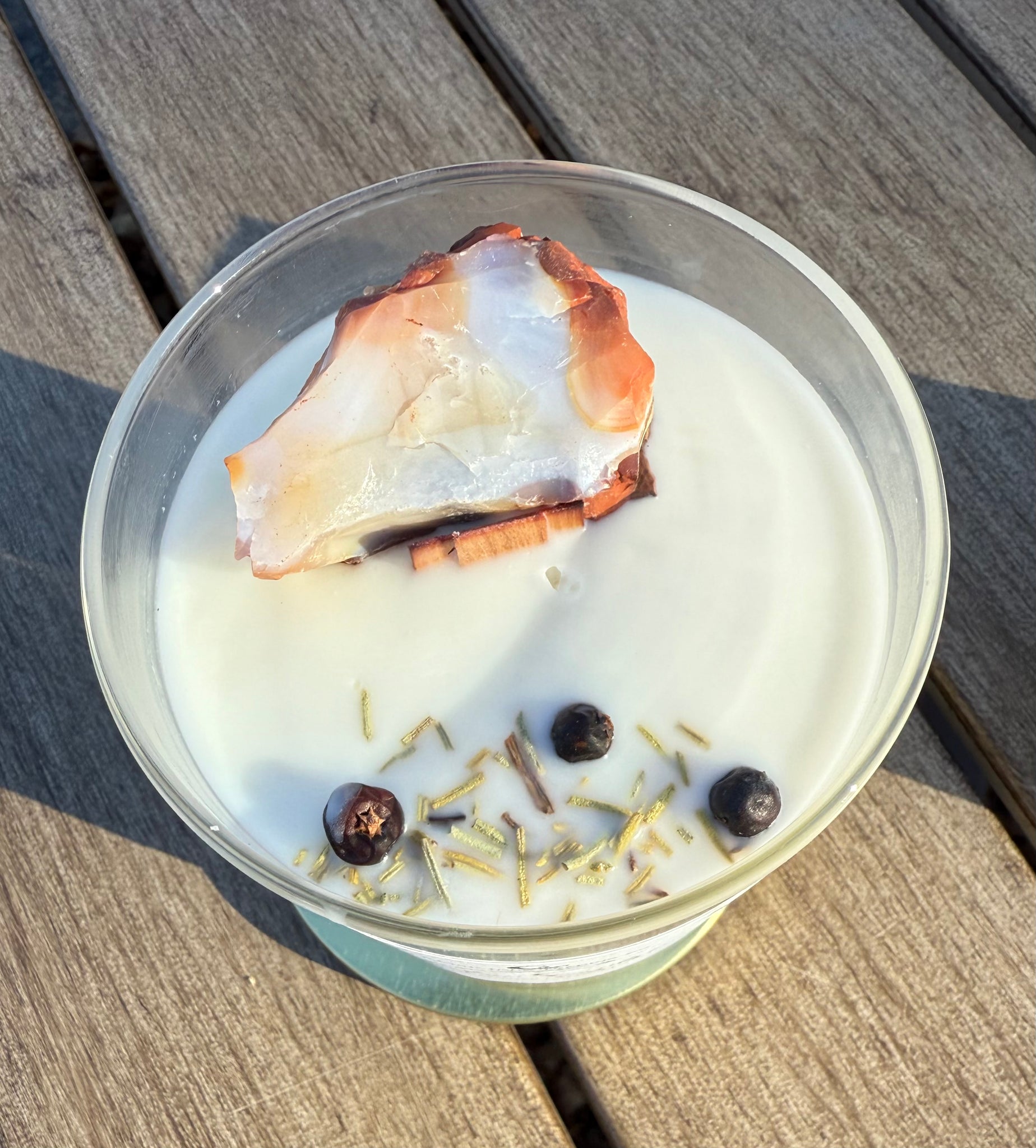 This candle was designed to help you celebrate the solstice in whatever way personally speaks to you. Adorned with a raw white carnelian a beautiful orange stone that literally visually looks like fire and light. Carnelian is known for its warm energy, promoting courage, and physical energy. It’s a stone often associated with fiery energy, fertility, and life, as well as love passion and confidence. It’s the perfect stone for this time of the year when the days grow darker, and the earth is renewed.