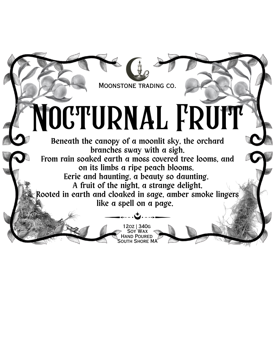 In homage to the beautiful decay nature gifts us, moonlit landscapes, and the magic of places left to grow wild, I bring to you Nocturnal Fruit. Have you ever seen an untended orchard, or a plant breaking through cracked cement, or vines swallowing up an old structure? Nocturnal Fruit embodies the quiet, eerie beauty of the earth reclaiming what was once its own. Inspired by my love of gothic fantasy and southern gothic literature and folklore, Nocturnal Fruit is expressed through scent and verse. A lyrical poem label is meant to capture the strange harmony between life and decay, growth, and ruin.